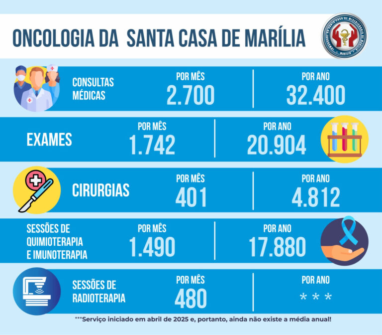 A Oncologia da Santa Casa de Marília realiza 4.812 cirurgias por ano e oferece atendimento integral no tratamento do câncer, segundo dados divulgados pela instituição. O serviço registra ainda 32.400 consultas médicas anuais, 20.904 exames e 17.880 sessões de quimioterapia e hormonioterapia, a maior parte pelo Sistema Único de Saúde (SUS).