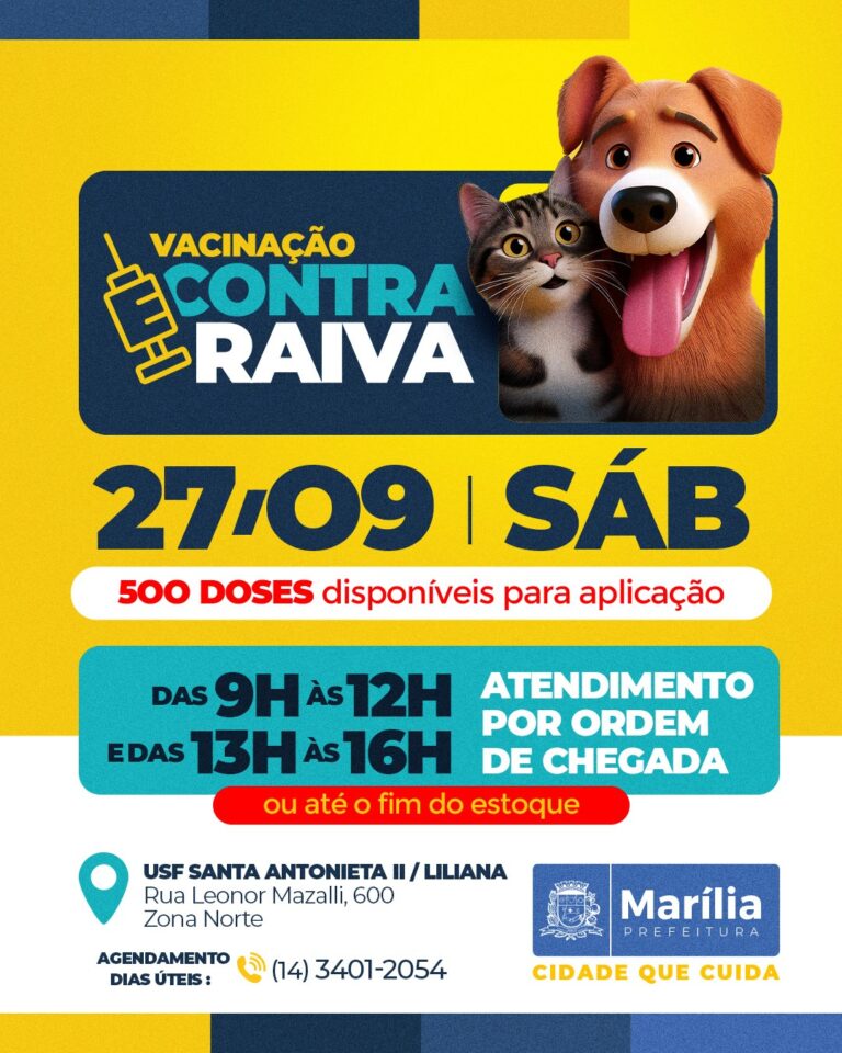 A Prefeitura de Marília, por meio da Secretaria Municipal da Saúde, realizará neste sábado (27) a 8ª ação de vacinação antirrábica do ano. A imunização ocorrerá na USF Santa Antonieta II/Liliana, na rua Leonor Mazalli, 600, zona norte da cidade, das 9h às 12h e das 13h às 16h, ou enquanto durar o estoque de 500 doses disponíveis.
