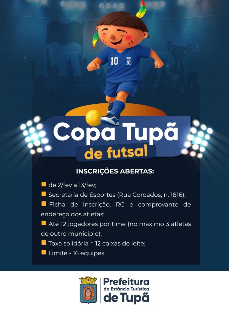 De acordo com a Secretaria de Esportes, a abertura oficial da Copa Tupã de Futsal está marcada para o dia 23 de fevereiro, no ginásio de esportes Elias Kenaifes. As inscrições seguem abertas até o dia 13 de fevereiro e devem ser realizadas presencialmente na sede da secretaria, localizada na rua Coroados, 1.816, no bairro Vila Tupã Mirim I.
