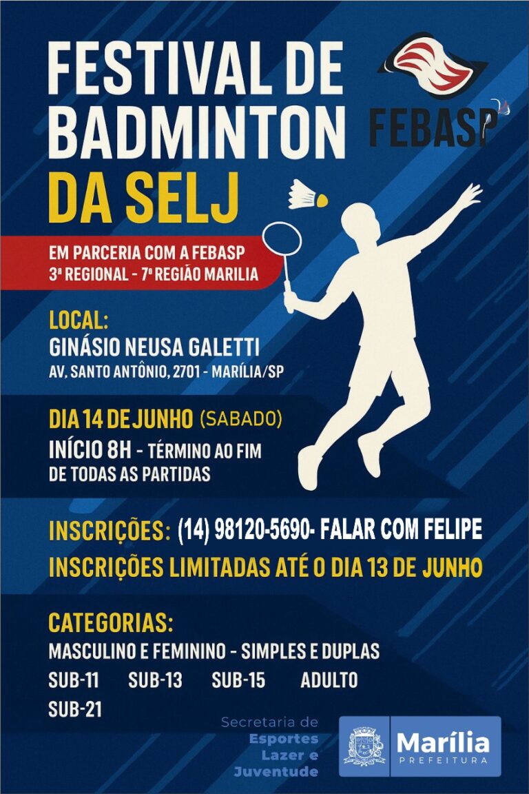 A Secretaria Municipal de Esportes, Lazer e Juventude (Selj) realiza no próximo dia 14 de junho, a partir das 8h, no Ginásio Neusa Galetti, o 1º Festival de Badminton.