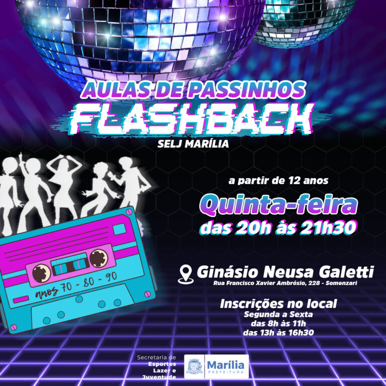 A Secretaria Municipal de Esportes de Marília inicia no próximo dia 11 de setembro uma nova turma de aulas de passinhos de flashback no ginásio Neusa Galetti. As atividades serão realizadas às quintas-feiras, das 20h às 21h30, e são gratuitas.