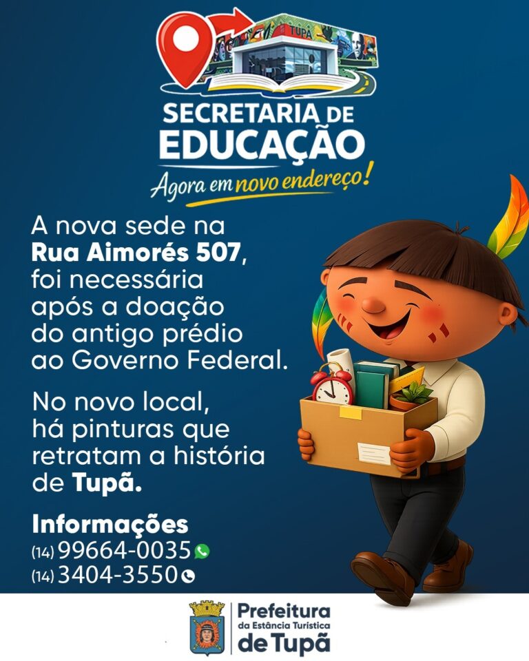 A Secretaria Municipal da Educação de Tupã passou a funcionar em novo endereço, conforme informou a Prefeitura da Estância Turística. A pasta agora atende na rua Aimorés, 507, em prédio que, segundo a administração, oferece mais espaço e melhor estrutura para servidores e munícipes.