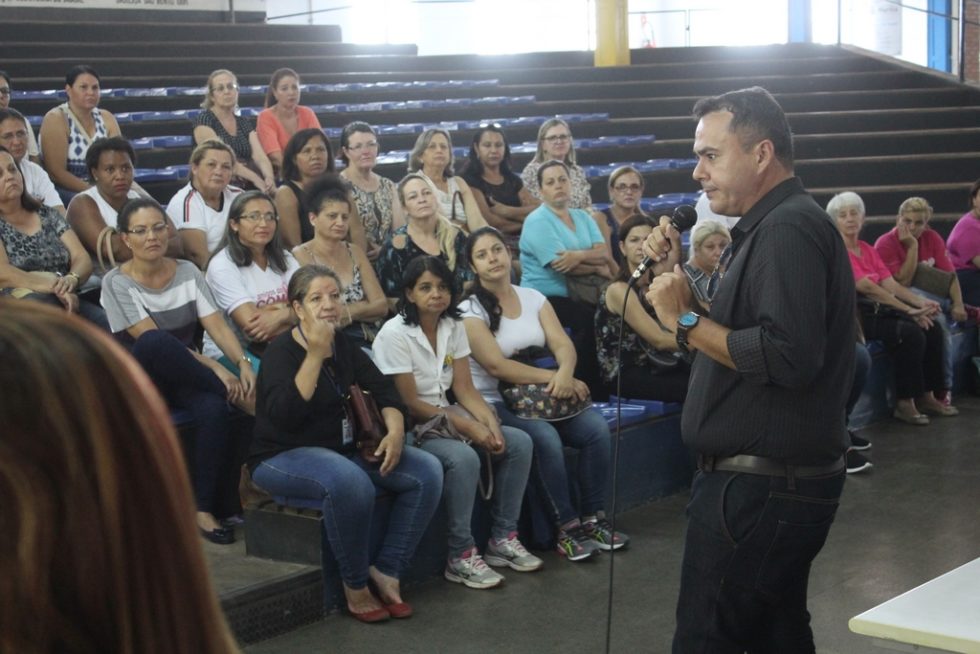 Secretário Helter Rogério Bochi fala às atendentes de escola durante encontro no Espaço Cultural (Foto: Amanda Guerra/Assessoria PMM)