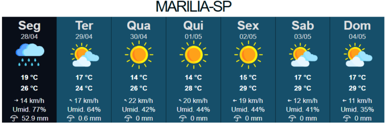 Ainda segundo os órgãos de meteorologia, não choverá mais em Marília até o próximo fim de semana, mas as temperaturas devem cair a partir desta terça-feira (29) devido à chegada de mais uma frente fria.