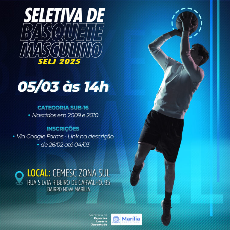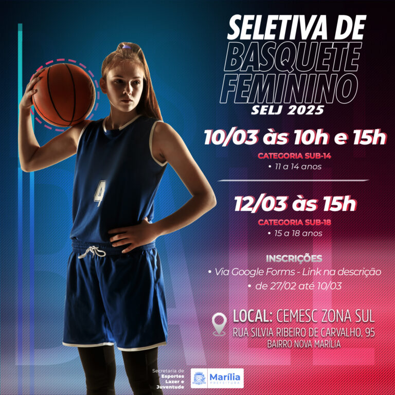 A Secretaria Municipal de Esportes, Lazer e Juventude (Selj) vai realizar seletiva para formação da categoria de base do Basquete feminino e masculino de Marília.