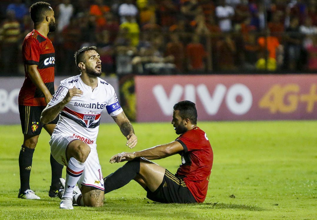 O Sport pressionava, empurrado pelos gritos do técnico Vanderlei Luxemburgo na beira do campo, e a defesa do São Paulo se defendia como dava. E antes do intervalo, em uma boa chance dos paulistas, Marcinho cruzou para a área, Pratto dominou, mas chutou desequilibrado, com perigo, para fora.