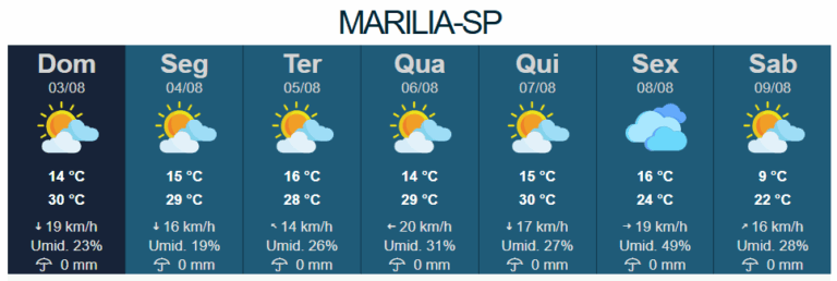 A semana em Marília será marcada por sol, calor e ausência de chuva, de acordo com a previsão estendida para os próximos sete dias. As informações são do Instituto de Pesquisas Meteorológicas (IPMet), com dados atualizados nas últimas horas.