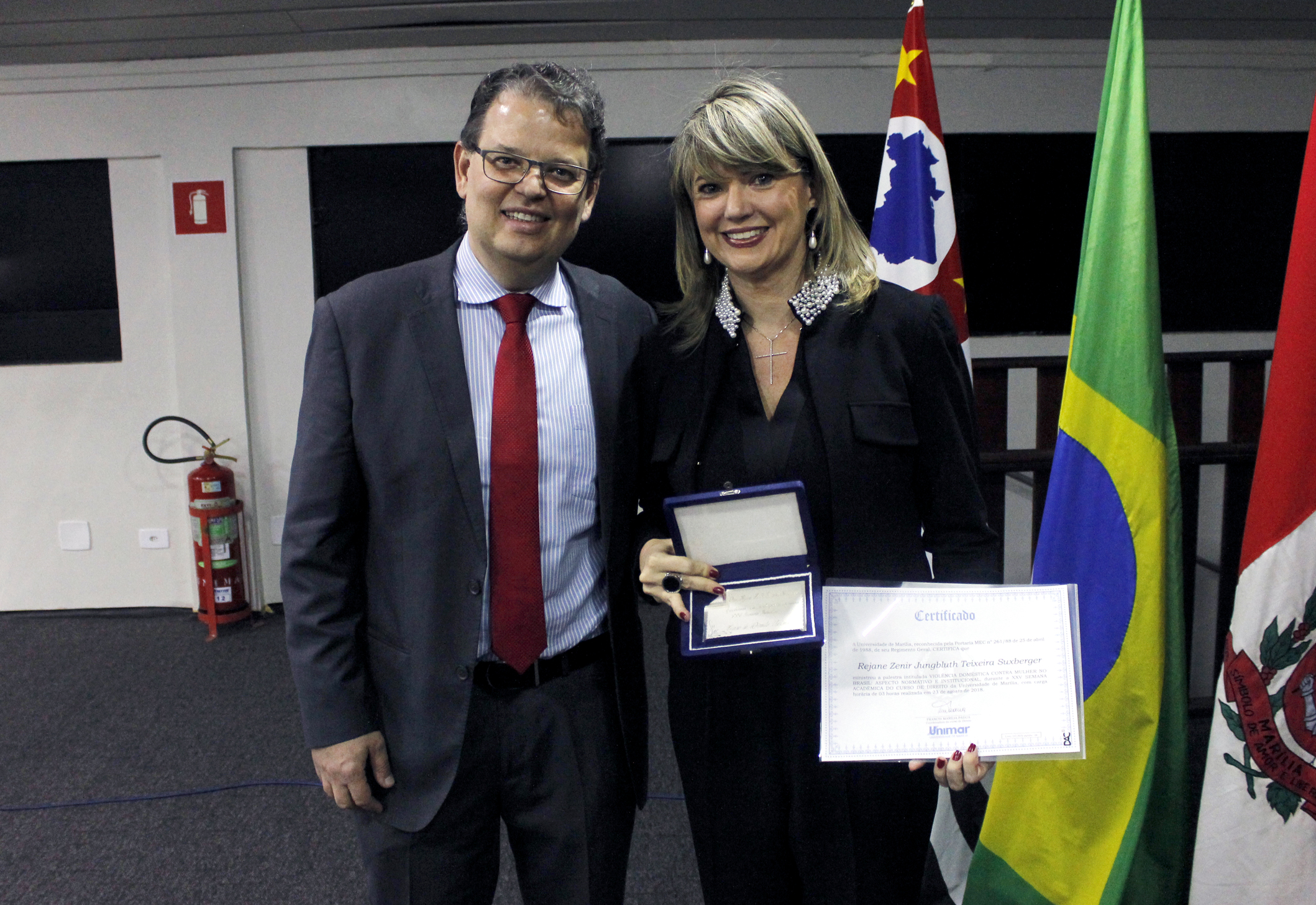 Docente Jefferson Aparecido Dias entrega certificado para a palestrante Dra. Rejane Zenir Jungbluth Teixeira Suxberger