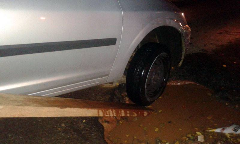 Carro é uma das ‘vítimas’ da cratera na rua Rua Geraldo Severino Cacique / Foto: Thiago Pinheiro
