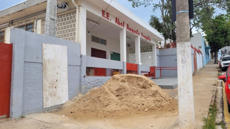 Areia na frente de escola indica que unidade está passando por reforma (Foto: Alcyr Netto/Marília Notícia)