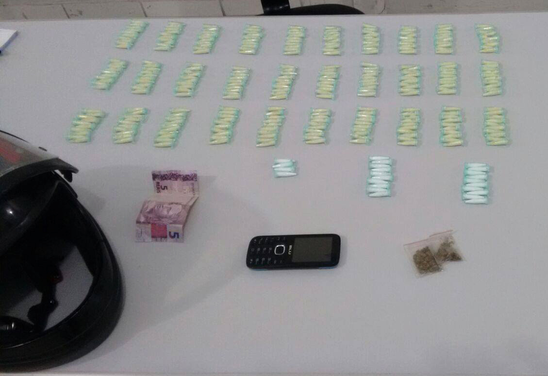 Luan já é conhecido nos meios policiais e prontamente se entregou. Disse que levava entorpecentes para a rua Antônio Lourenço, onde os venderia. Foram apreendidos 300 pinos com crack, 24 com cocaína, 2 porções de maconha, celular e pequena quantidade em dinheiro.