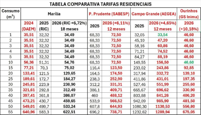 No comunicado, a empresa afirmou que, mesmo após a atualização, Marília vai manter a menor tarifa mínima entre municípios de porte semelhante sob regime de concessão. Foram citadas Presidente Prudente, Ourinhos e Campo Grande como exemplos de cidades que aplicaram reajustes recentes e operam com valores superiores (veja a tabela abaixo).