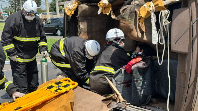 O cenário simulado incluiu uma colisão lateral entre um carro e um caminhão-tanque, resultando em múltiplas vítimas, vazamento de líquido inflamável e necessidade de combate a incêndio.