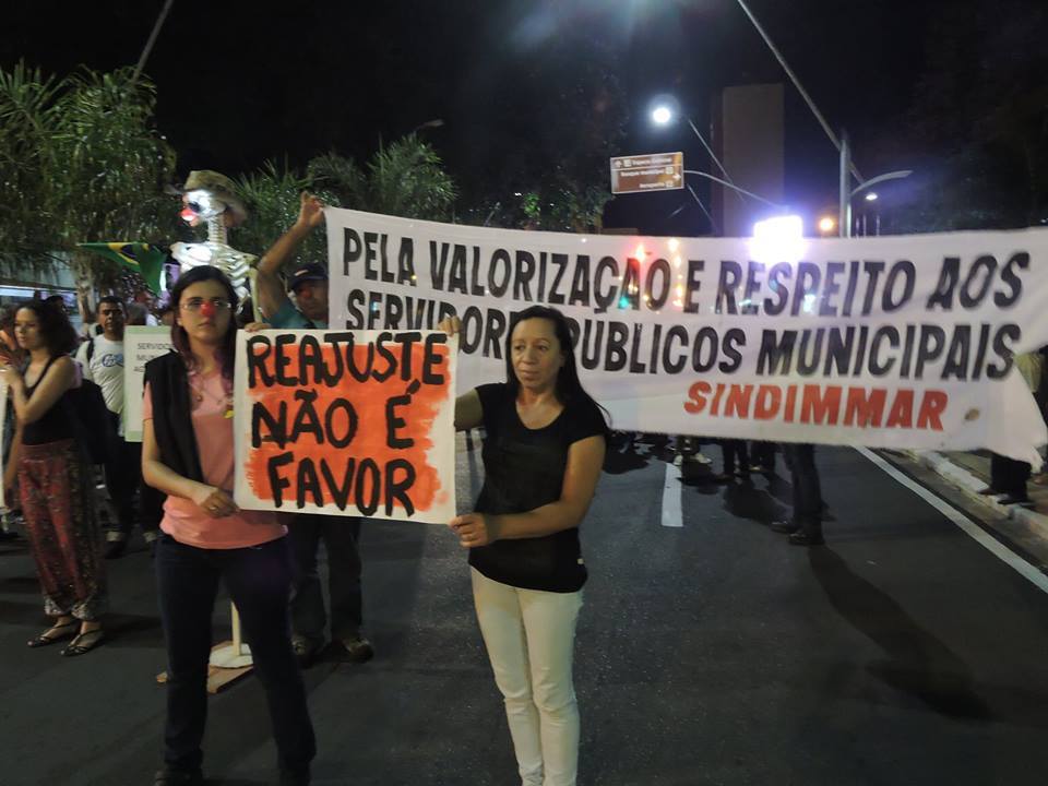 A manifestação teve início em frente à Prefeitura e depois seguiu para o prédio da Câmara, onde ocorria a sessão ordinária. Os cerca de 150 manifestantes cobraram dos vereadores diálogo com o prefeito Vinicius Camarinha para pressionar o pagamento.