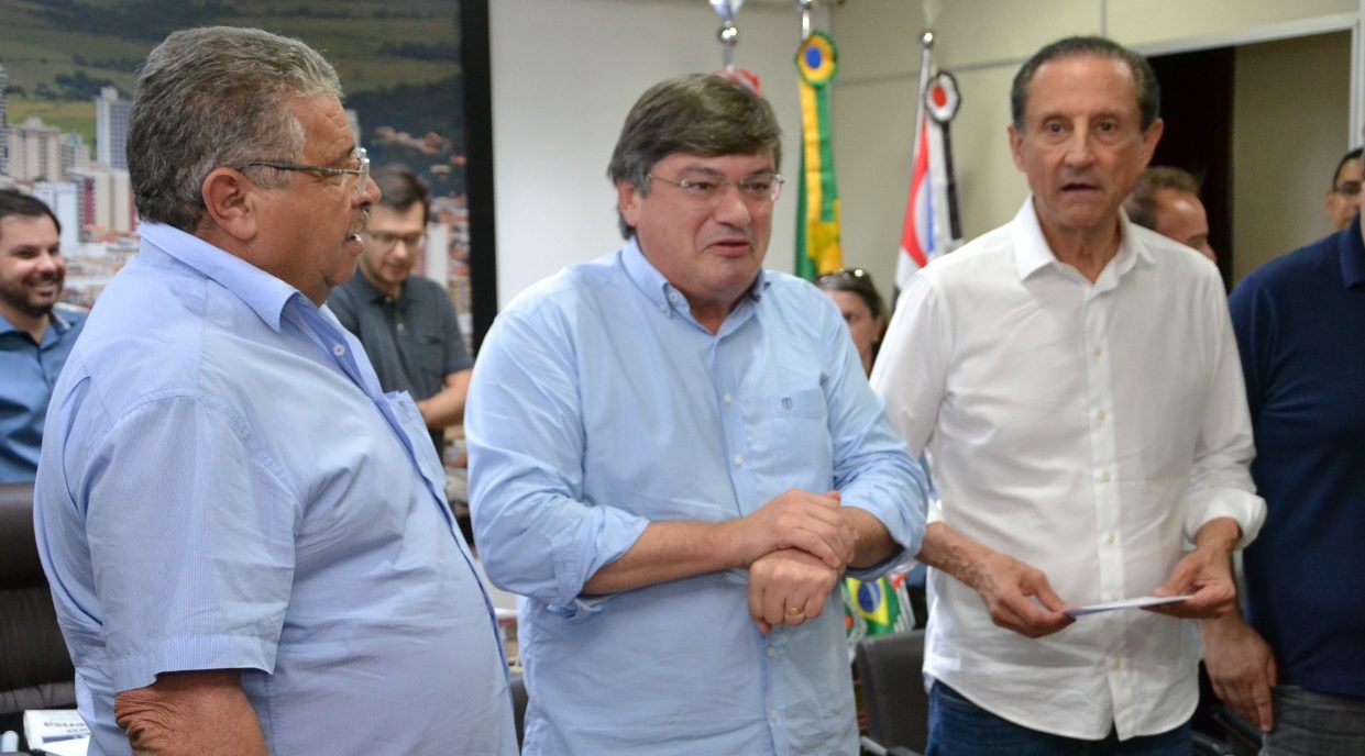 Tato (MDB), Daniel Alonso (PSDB) e Skaf (MDB) reunidos na Prefeitura (Foto Leonardo Moreno)