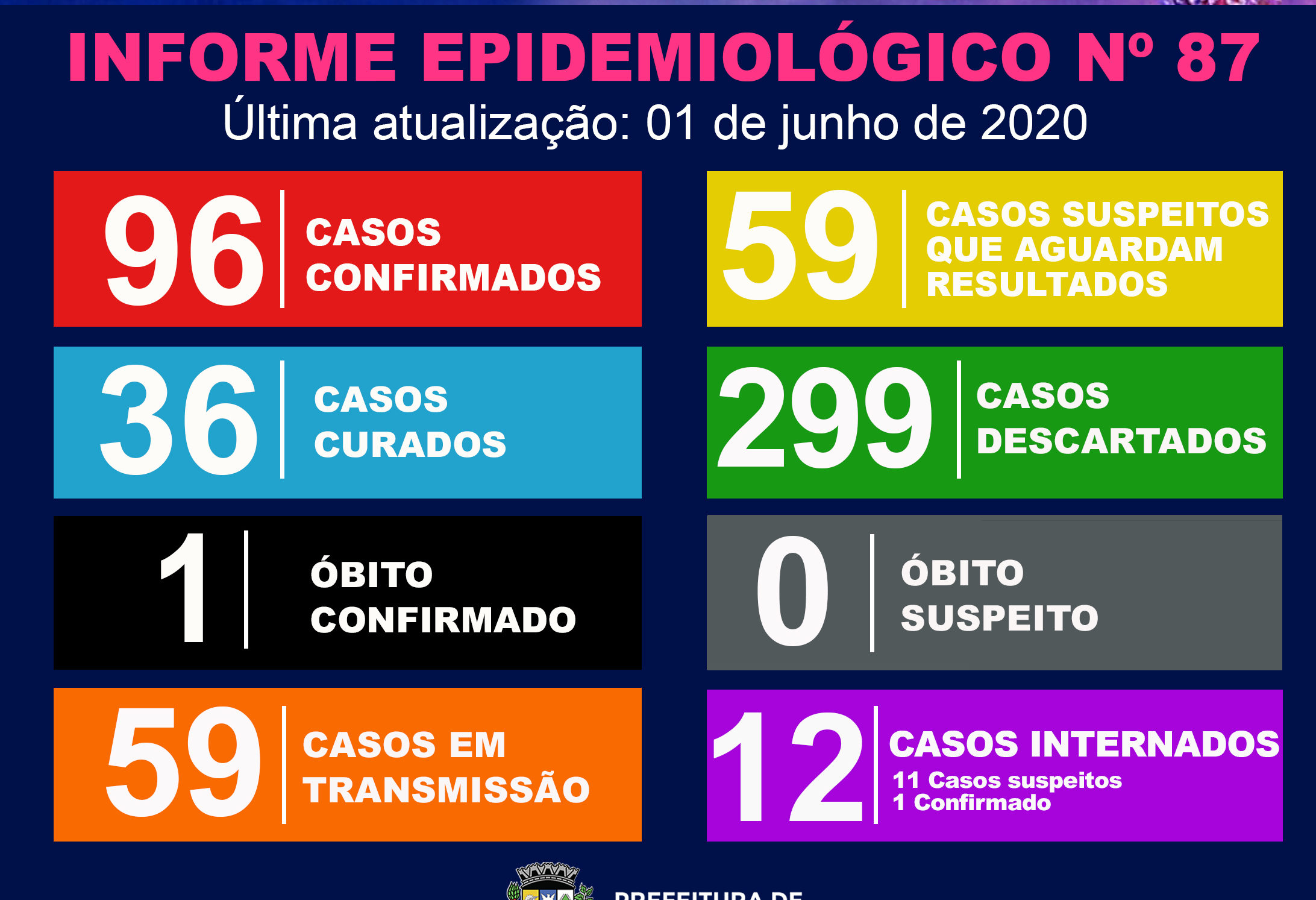 O boletim epidemiológico mostra que 59 casos suspeitos aguardam resultados de exames. A cidade mantém um óbito confirmado por Covid-19 e nenhuma morte suspeita está em investigação.