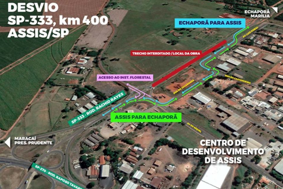 Já no sentido de Assis para Marília, o condutor vai acessar a alça de saída da Raposo Tavares no km 444, na pista Oeste (Ourinhos – Prudente) e seguir pelo desvio sinalizado, na rua do Jacarandá, rua da Castanheira e avenida Luiz Kobal, até acessar a SP-333 e seguir viagem.