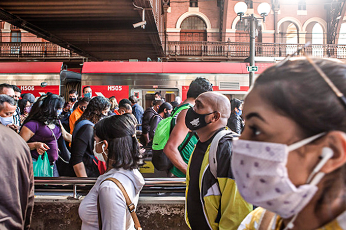 Commuters wearing protective masks walk inside the Luz train station in Sao Paulo, Brazil, on Monday, June 22, 2020. Latin America's most populous country is only the second nation to reach the grim milestone of 1 million cases and, like in the U.S., the surge can be traced to reopenings and social distancing measures being lifted. Photographer: Jonne Roriz/Bloomberg via Getty Images