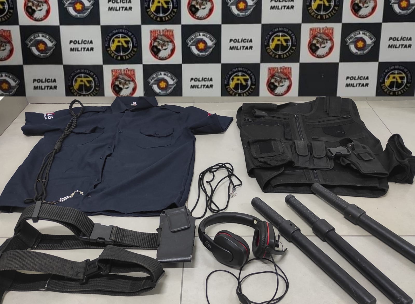 Entre os itens recuperados, estavam uma capa de colete balístico, cacetetes, uma farda de segurança patrimonial e um cinto tático.