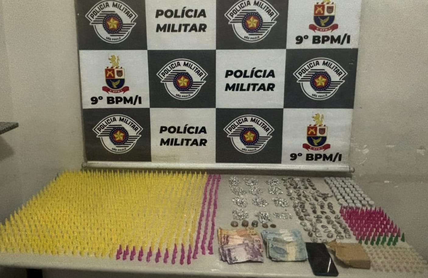 Na mochila e na sacola apreendidas, foram encontrados 1,1 quilo de cocaína, 328 gramas de crack, 455 gramas de maconha e R$ 353 em dinheiro.