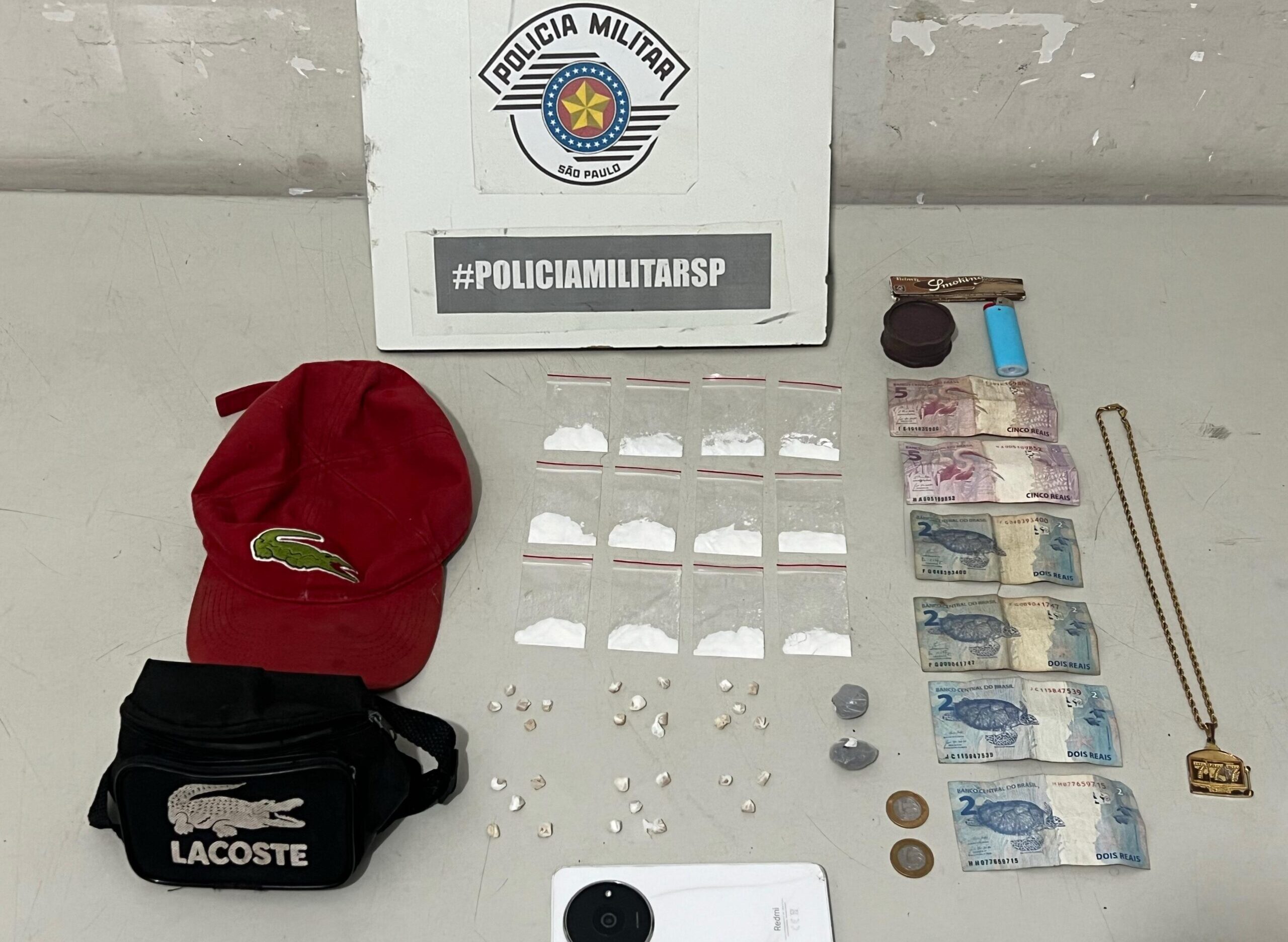 Na cintura dele havia uma pochete com itens que indicam o envolvimento com o tráfico, como um dichavador, 28 pedras de crack, 12 papelotes com cocaína, duas porções de maconha, além de R$ 20 em notas e moedas diversas.
