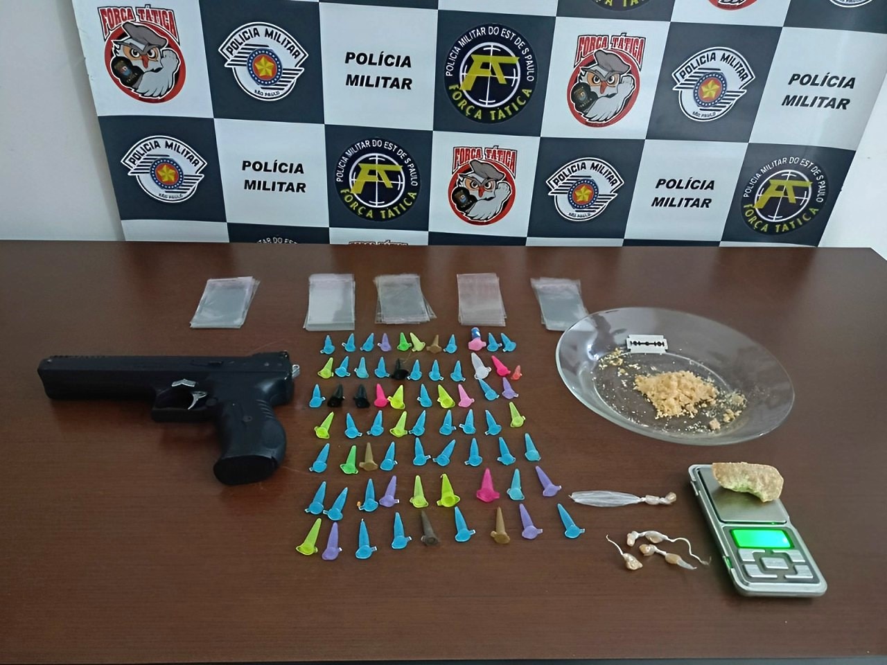 Equipe da Polícia Militar de Tupã, em ação na noite desta terça-feira (12), prendeu um homem acusado de tráfico de drogas. Busca foi feita pela Força Tática, durante patrulha pela zona leste, a mais populosa da cidade. Um simulacro de arma de fogo foi encontrada com o suspeito.