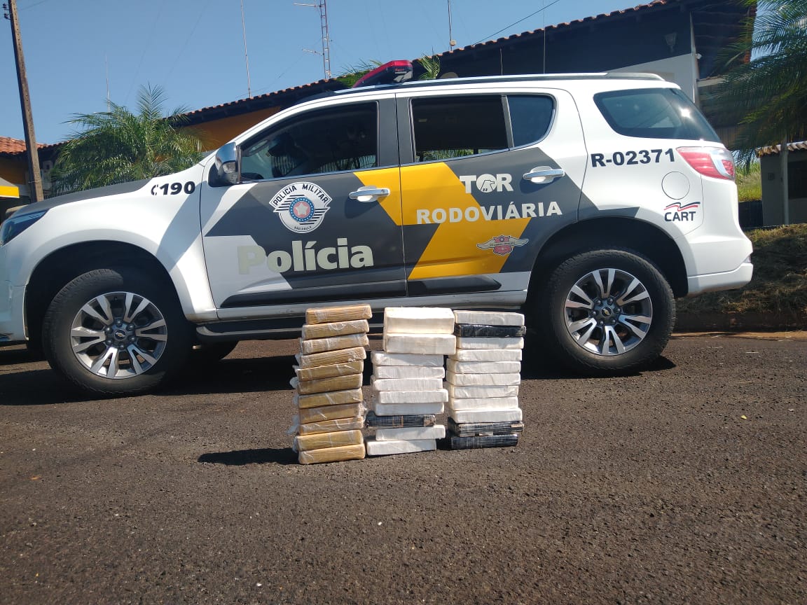 O condutor apresentou nervosismo fora do comum e os policiais realizaram uma busca minuciosa no veículo, sendo localizado um fundo falso, contendo em seu interior 33 tabletes de cocaína.