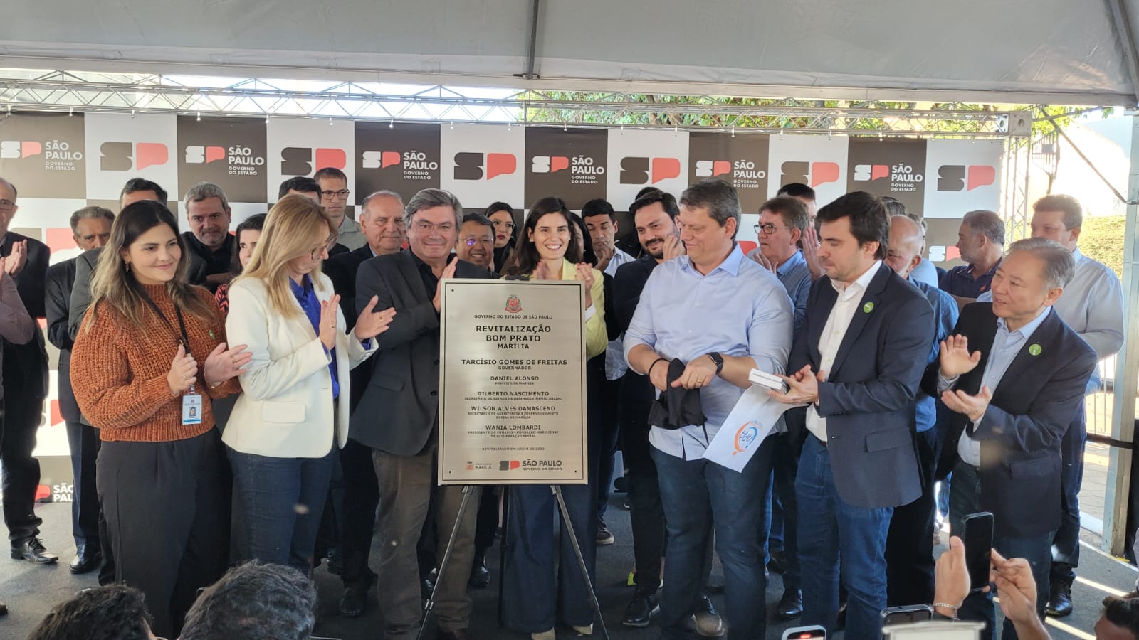 Governador Tarcísio e autoridades participaram o descerramento da placa de reinauguração do restaurante Bom Prato em Marília (Foto: Alcyr Netto/Marília Notícia)
