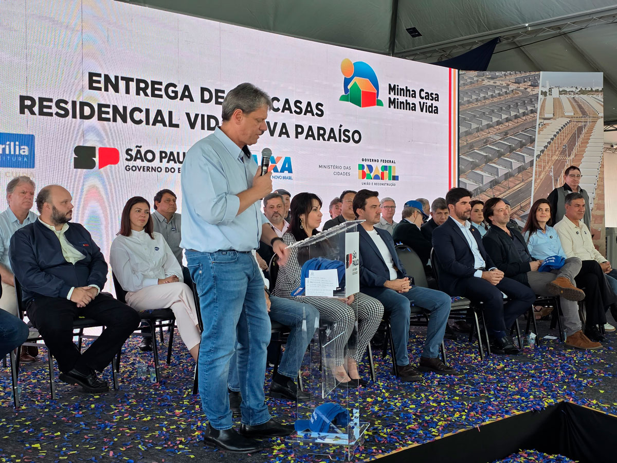 O governador de São Paulo, Tarcísio de Freitas (Republicanos), visitou Marília nesta sexta-feira (27) para entregar 806 casas do Residencial Vida Nova Paraíso, novo bairro construído na zona norte da cidade. Durante o discurso, ele aproveitou para alfinetar o presidente Luiz Inácio Lula da Silva (PT), ao brincar com a famosa promessa da “picanha”, usada pelo petista na campanha de 2022.