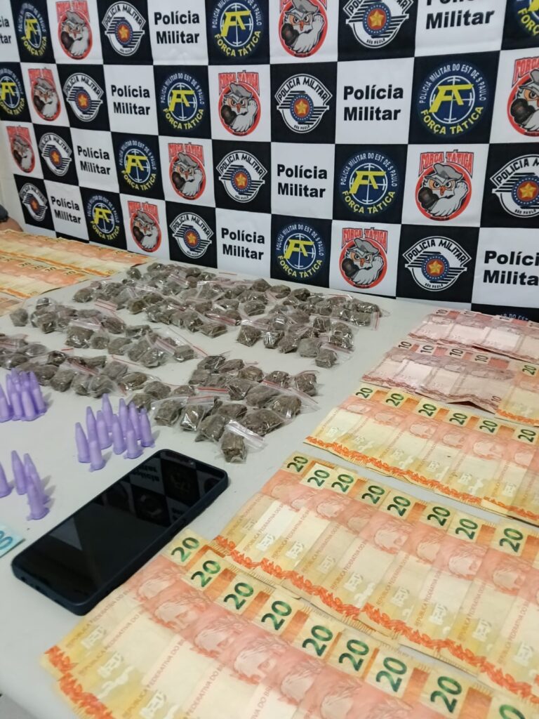 Na revista pessoal, os militares localizaram R$ 4 mil em uma pochete, além de um telefone celular. Já na mochila abandonada, foram encontradas 55 porções de cocaína (120,17 gramas) e 130 porções de maconha (483,86 gramas), todas embaladas e prontas para venda.