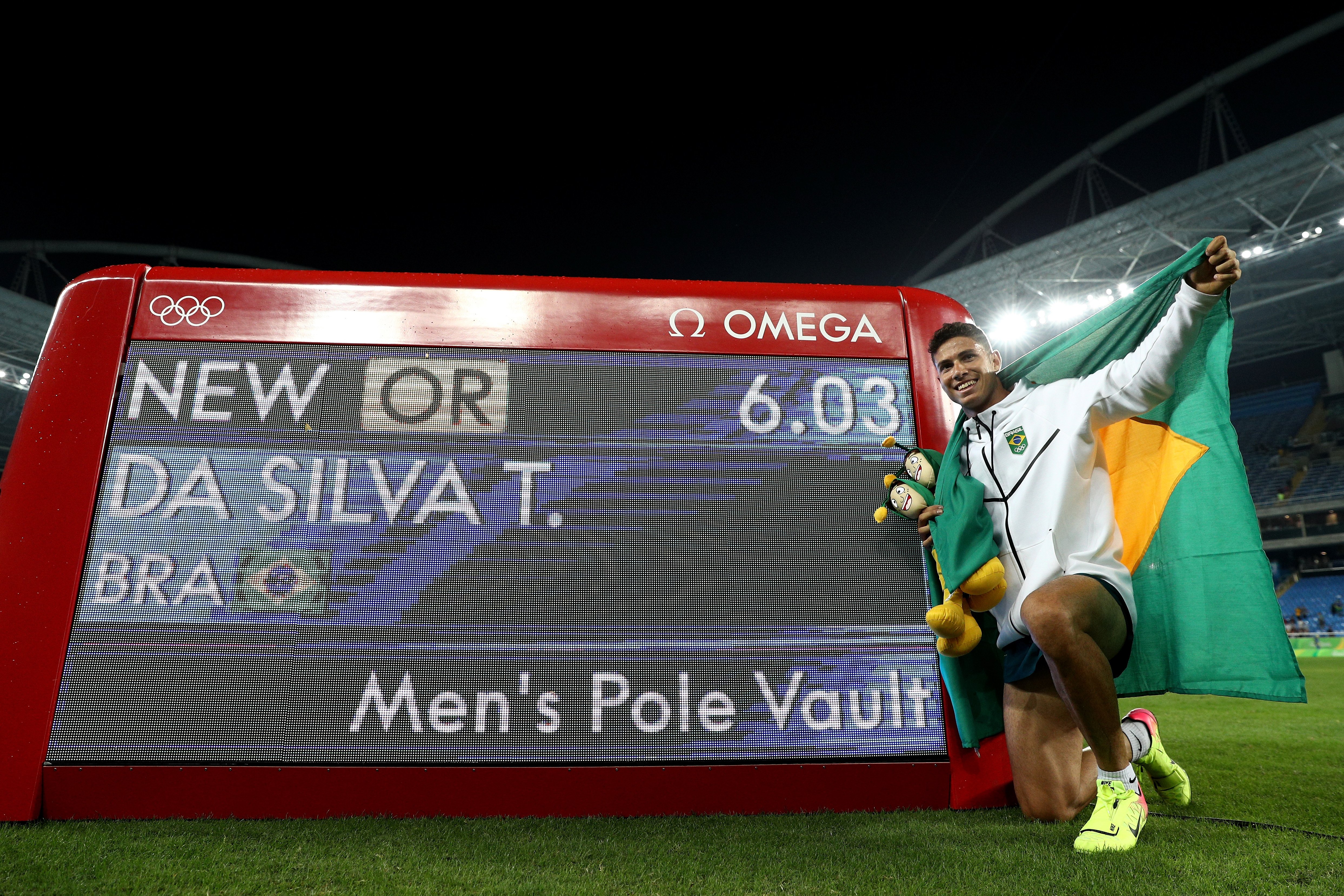 RIO DE JANEIRO, BRAZIL - AUGUST 15: Thiago Braz da Silva of Brazil celebrates winning the Men's Pole Vault final with a new Olympic record of 6.03 on Day 10 of the Rio 2016 Olympic Games at the Olympic Stadium on August 15, 2016 in Rio de Janeiro, Brazil. (Photo by Paul Gilham/Getty Images)