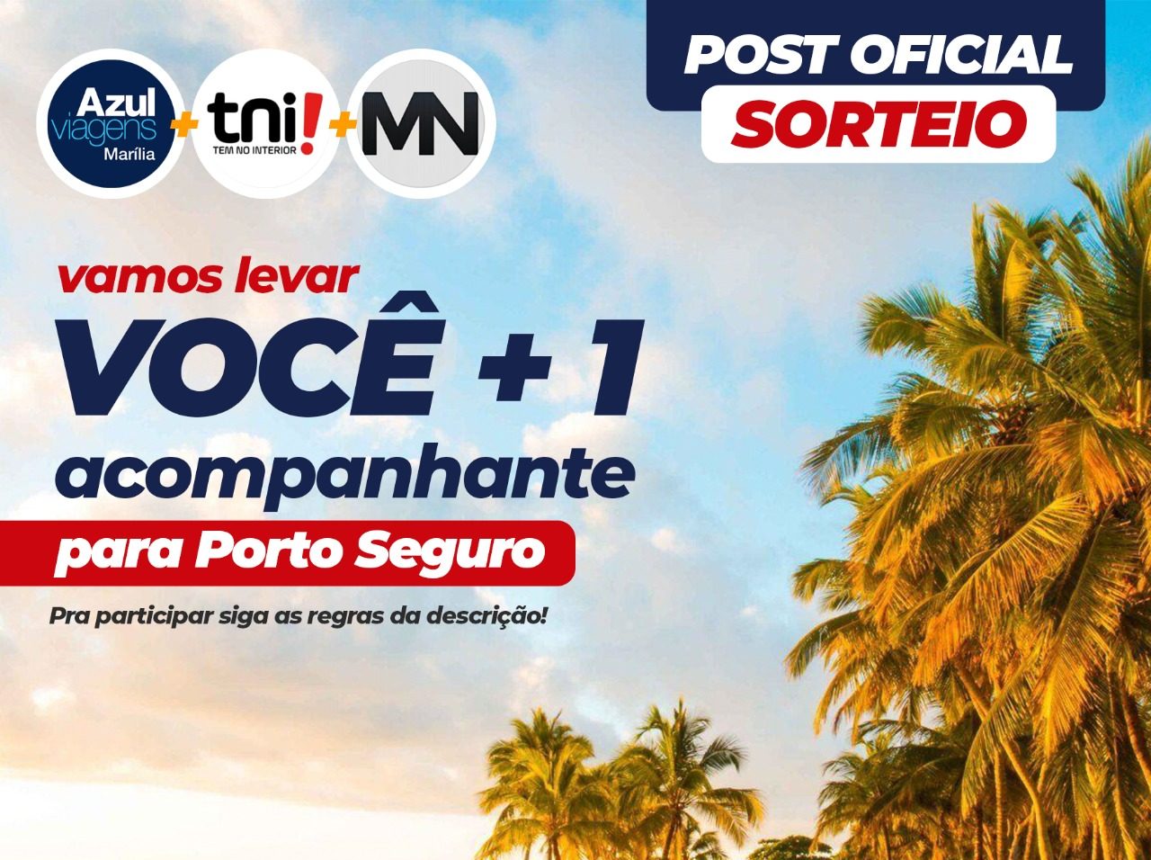 A página Tem no Interior (TNI), em parceria com o Marília Notícia e Azul Viagens Marília, está sorteando uma viagem com acompanhante para Porto Seguro, na Bahia, com sete noites de hospedagem em hotel categoria turística.