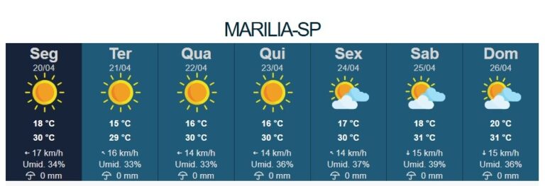 De acordo com dados dos radares do Instituto de Pesquisas Meteorológicas (IPMet) de Bauru e do Climatempo, os próximos dias serão de sol predominante e calor, sem registro de precipitações. Entre esta segunda-feira (20) e o domingo (26), a previsão indica acumulado de 0 milímetro de chuva.
