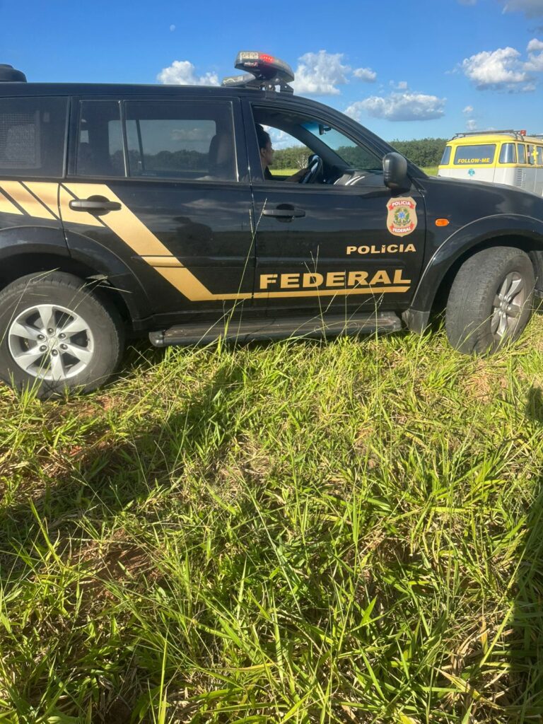 Imagens do episódio mostram viaturas da Polícia Militar e da Polícia Federal posicionadas na área gramada do aeroporto, além de um planador e veículos de apoio próximos ao local da ocorrência.