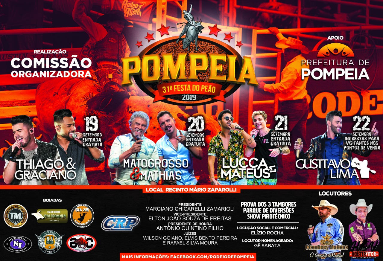 Começa nesta quinta-feira (19) a 31ª edição da tradicional Festa do Peão de Pompeia (distante 31 quilômetros de Marília). A abertura será com a apresentação da dupla Thiago e Graciano. A entrada é gratuita.