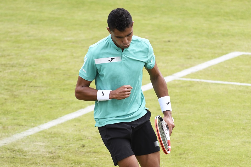 ILKLEY, ENGLAND - JUNE 18: Thiago Monteiro of Spain reacts during his game against Paul Jubb of Great Britain during the Ilkley Trophy - Day Two at Ilkley Lawn Tennis & Squash Club on June 18, 2019 in Ilkley, England. (Photo by George Wood/Getty Images)