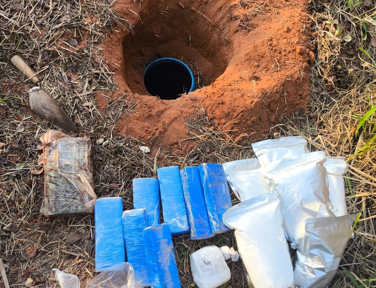 O homem acionou a Polícia Militar que, ao desenterrar o recipiente, encontrou diversas substâncias entorpecentes. O conteúdo apreendido revelou sete tijolos de maconha, um de crack e um bloco compactado com cocaína.