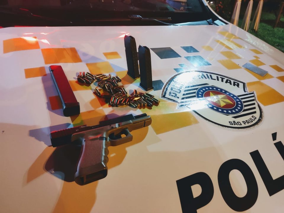 Os policiais fizeram uma busca no interior do veículo, no qual encontraram escondidos, em um local de difícil acesso, uma arma de fogo, pistola 9mm, três carregadores e 45 munições.