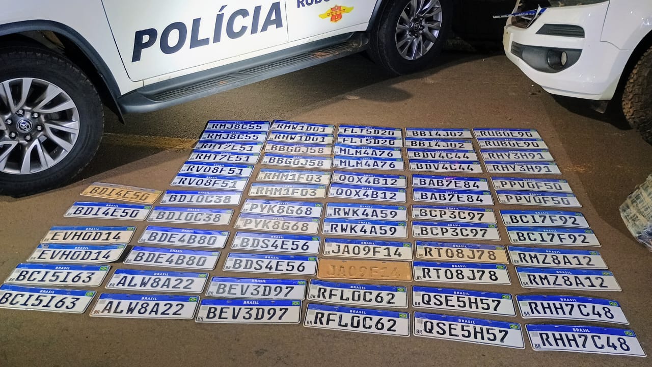 Um verdadeiro estoque de placas frias com 34 pares (sendo 68 peças) com diferentes identificações, usadas para despistar a polícia, foi apreendido com um homem que transportava 1,2 tonelada de maconha em uma caminhonete pela região. Ele foi descoberto na madrugada desta quarta-feira (11) por policiais do grupo Tático Ostensivo Rodoviário (TOR), a elite de repressão criminal da Polícia Militar Rodoviária.
