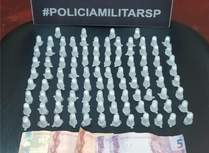 Na busca pessoal, os policiais localizaram no bolso da bermuda R$ 80. No saco transparente foram contabilizados 30 microtubos com cocaína.