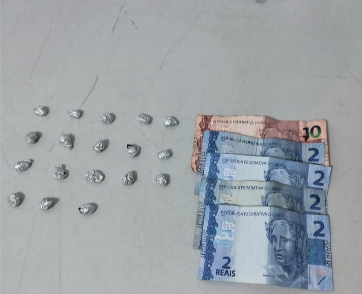 Durante a abordagem, os militares encontraram com ele seis pedras de crack embaladas para venda e R$ 18. Na sequência, durante varredura nas proximidades, localizaram mais 12 pedras de crack escondidas no pé de uma árvore.