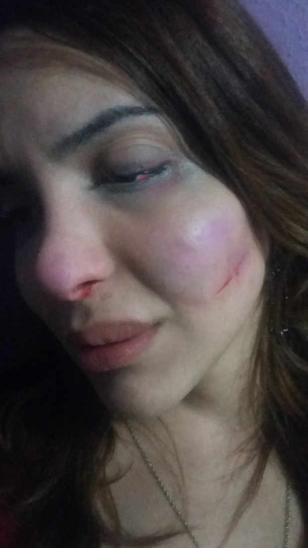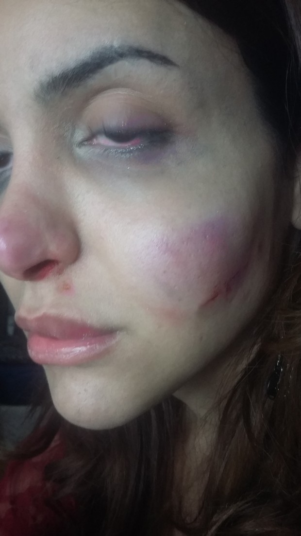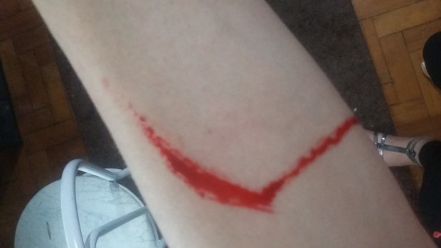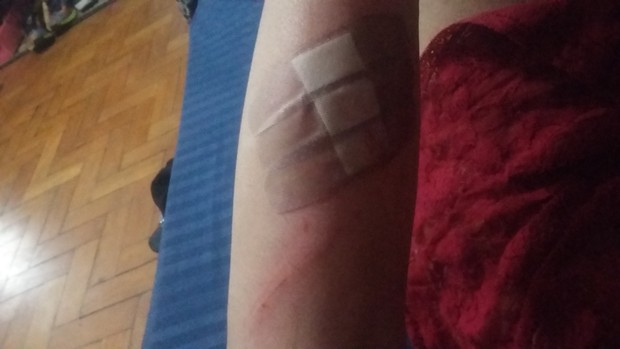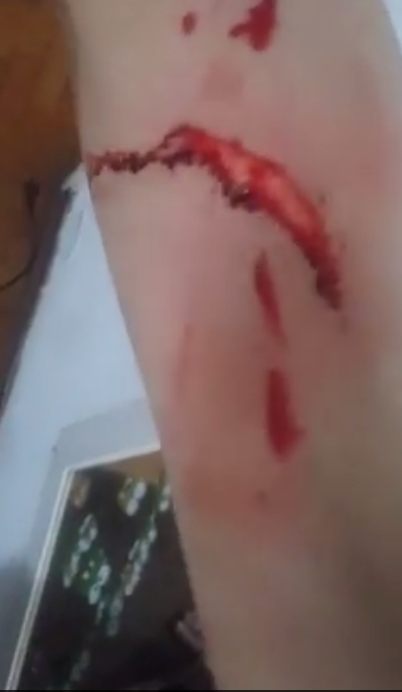 “Segui reto, mas vieram atrás, foi muito rápido. Vieram com uma faca ou uma gilete, não vi o que era. Me seguraram para tentar cortar a minha barriga, só que não conseguiram, cortaram meu braço. Eu fiquei me abaixando pra me esquivar dos socos, mas mesmo assim estou com o rosto todo machucado, meu nariz está inchado, meu maxilar rasgado.”