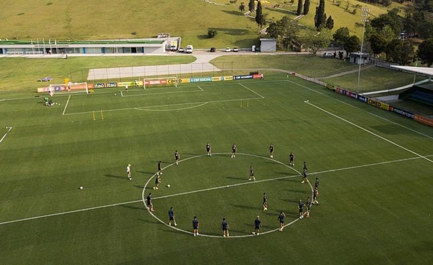 Antes de Tite e seus auxiliares comandarem a atividade com bola, o preparador físico Fábio Mahseredjian reuniu os jogadores para as primeiras instruções no centro do gramado. A linha do círculo central serviu como guia para os atletas. Não houve contato. Assim como os almoços na Granja Comary em tempos de pandemia, o treino também foi dividido em dois. Um grupo treinou no gramado principal, mas em campo reduzido. O outro fez atividades físicas no gramado ao lado.
