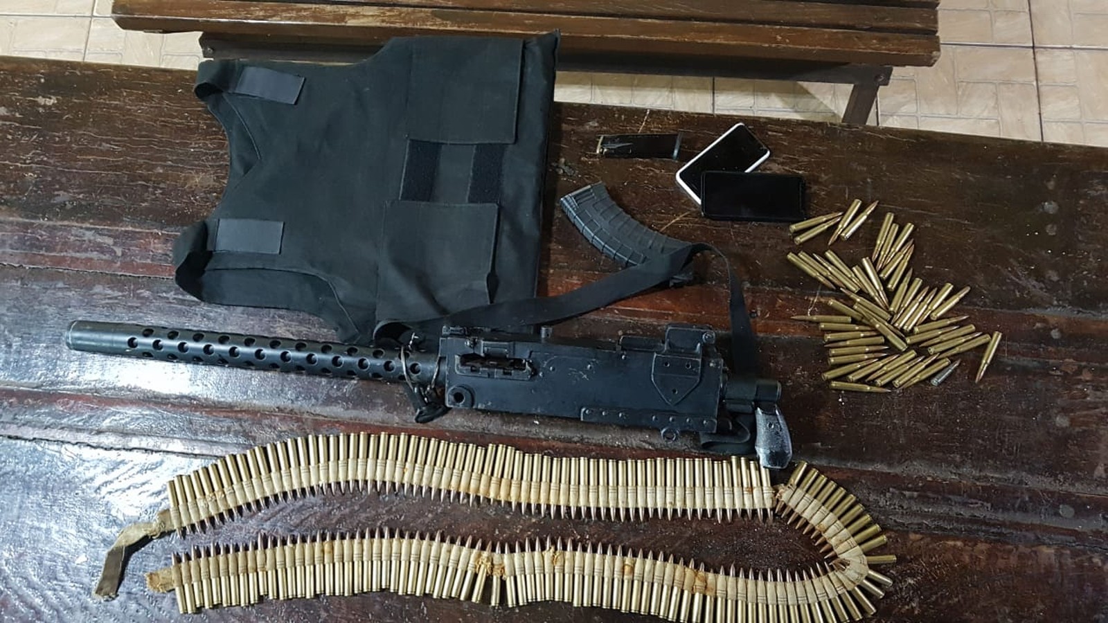 No imóvel, os policiais apreenderam duas pistolas ponto 40, uma metralhadora calibre 762, um colete balístico, além de outras armas e munições.