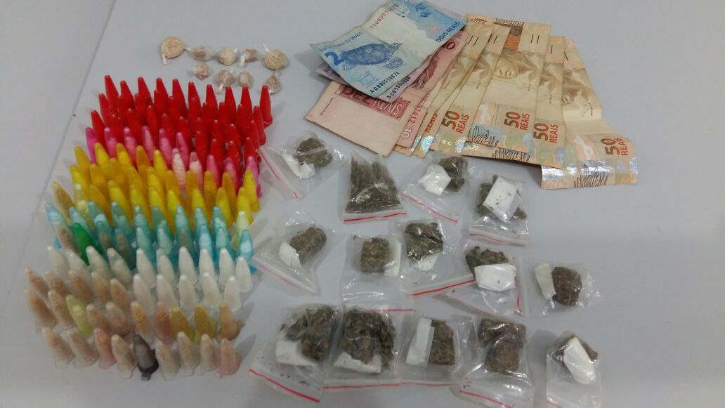 Marcelo dos Santos, de 26 anos, e um adolescente de 16 anos tentaram se desfazer de uma garrafa pet com 36 porções de crack e 102 porções de cocaína, mas acabaram interceptados. Durante revista pessoal também foi localizado R$ 327.