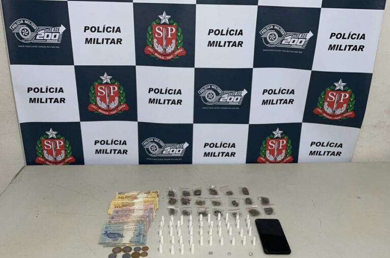 Com ele, os policiais encontraram 44 pinos de cocaína, três pedras de crack e 20 porções de maconha, além de R$ 283,50 e um celular.