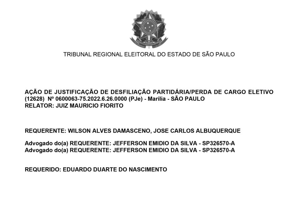 Em decisão proferida na última sexta-feira (29), o colegiado do Tribunal Regional Eleitoral do Estado de São Paulo (TRE-SP) acatou o pedido do PSDB e do primeiro suplente Wilson Damasceno para a perda do cargo de vereador de Eduardo Nascimento, por desfiliação sem justa causa.