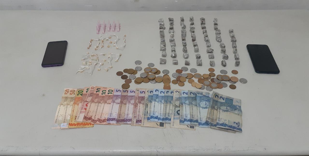 Os três já são conhecidos nos meios policiais por tráfico de drogas e por isso foi realizada uma busca no carro onde foi localizado um estojo contendo 67 porções de maconha, 51 de crack, 17 de cocaína e a quantia de R$ 246,15.