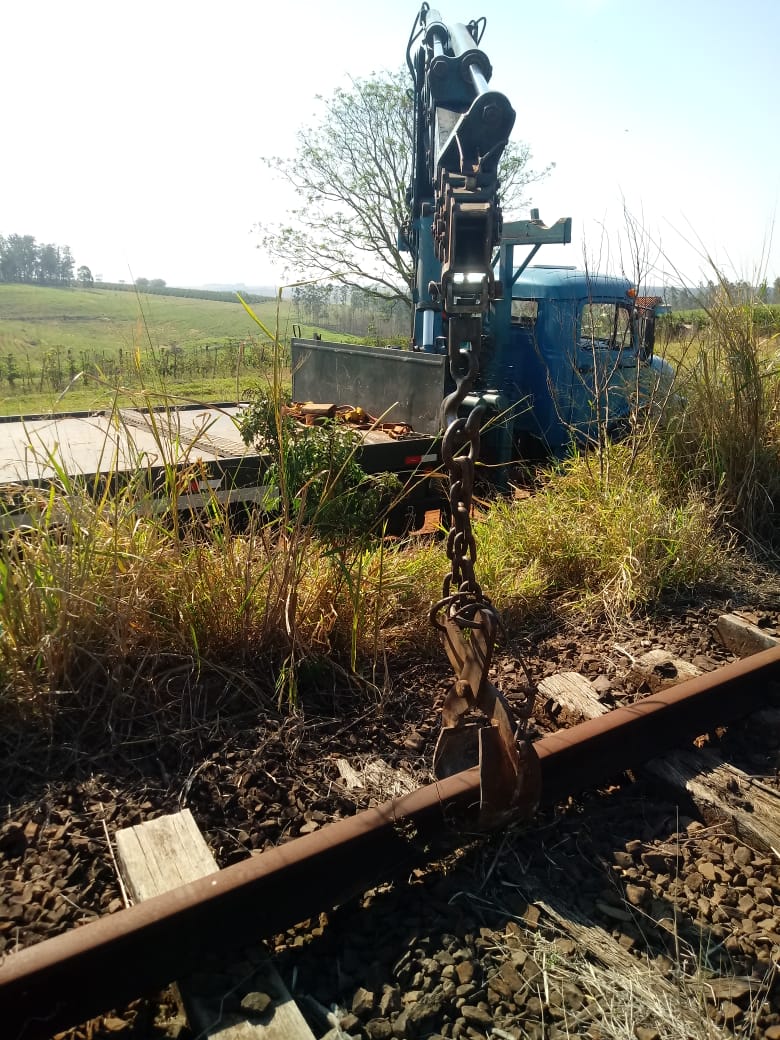 Após serem acionados, os policiais militares, localizaram três indivíduos com um caminhão tentando retirar dois trilhos, já cortados, de aproximadamente 12 metros.