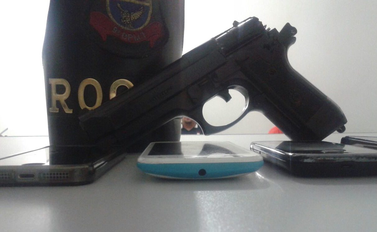 Simulacro de arma e celulares apreendidos pela Rocam (Foto: Divulgação)
